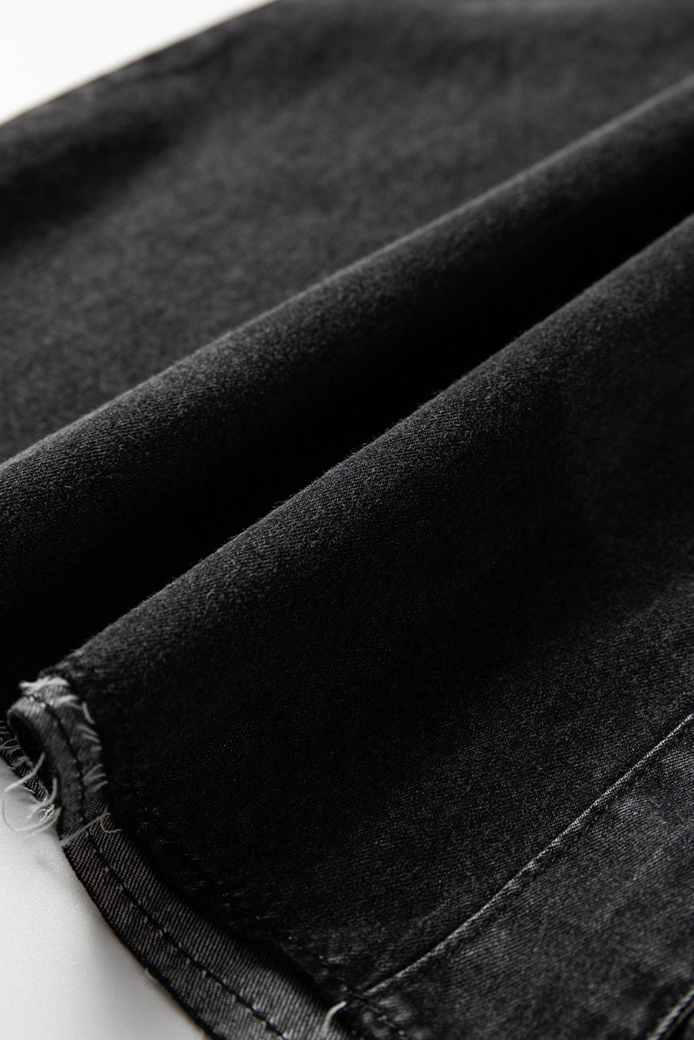 Designed with snap buttons, flap pockets, and raw edge hemline.