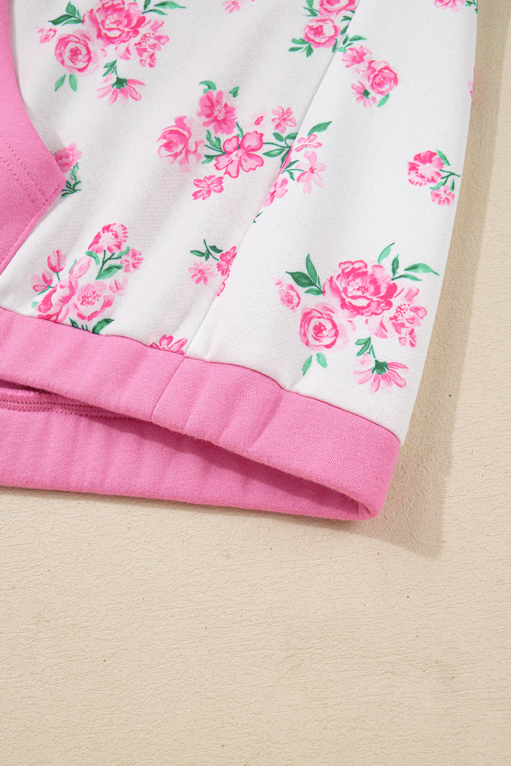 Pink Plus Size Contrast Polo Collar Floral Patchwork Elastic Cuffs Long Sleeve Top