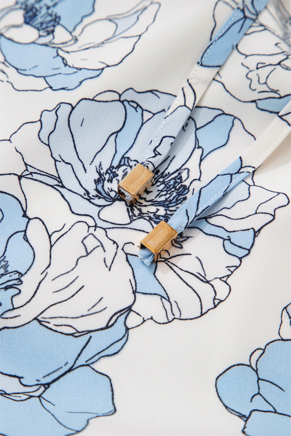 Sky Blue Floral Print Tie Neck Long Sleeve Flowy Mini Dress