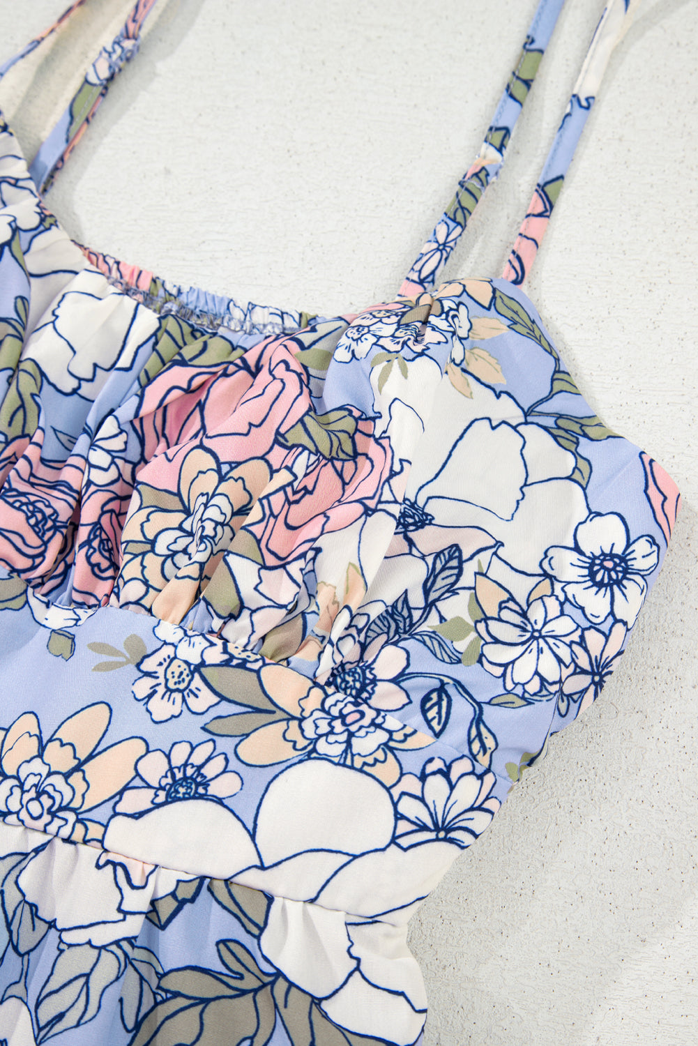 Sky Blue Floral Tiered Patchwork Spaghetti Strap Vacation Dress
